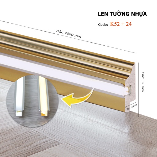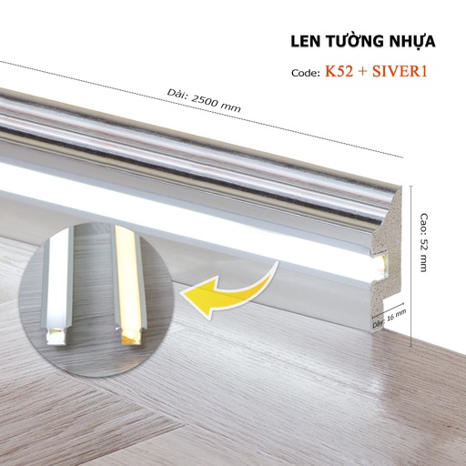 Len đèn led K52 là giải pháp phụ kiện chân tường 2-trong-1 đột phá, kết hợp hoàn hảo giữa công năng trang trí và hiệu ứng chiếu sáng hiện đại. Sản phẩm được làm từ nhựa PS cao cấp, tích hợp sẵn rãnh kỹ thuật thông minh để lắp đặt dây đèn LED, vừa bảo vệ mép sàn và chân tường khỏi va đập, bụi bẩn, vừa tạo ra dải sáng hắt tinh tế, sang trọng. Với chiều cao 52mm và thiết kế đa dạng bề mặt hoàn thiện như Inox, Gold, Rose Gold, len tường nhựa K52 không chỉ che đi những khuyết điểm thi công mà còn là điểm nhấn thẩm mỹ đắt giá, nâng tầm giá trị cho mọi không gian từ nhà ở, căn hộ đến các công trình thương mại đẳng cấp.