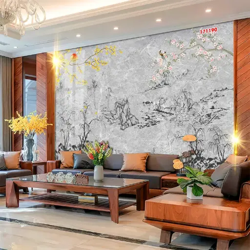 Không gian phòng khách là nơi lý tưởng để phô diễn vẻ đẹp của phong cách này. Một bức tranh lớn sau sofa hoặc ở vách tivi sẽ trở thành tâm điểm của cả căn phòng. Bạn có thể tham khảo các ý tưởng tại bộ sưu tập tranh PVC vân đá mẫu cho phòng khách để tìm cảm hứng.