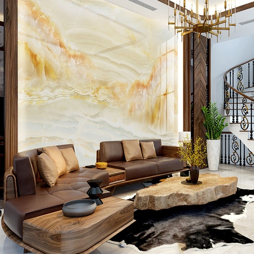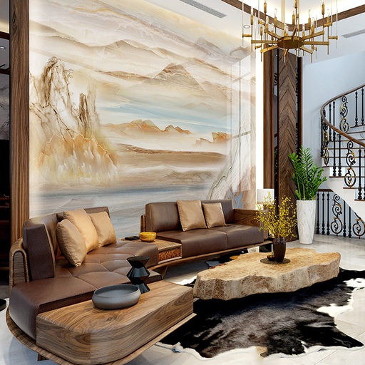 • Vẻ đẹp sang trọng, đẳng cấp: Họa tiết vân đá tự nhiên tinh xảo mang lại chiều sâu và sự sang trọng cho không gian phòng khách.
