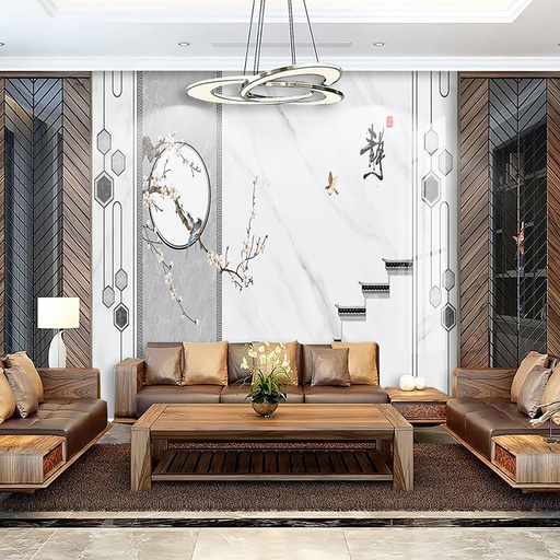 Ngoài ra, bố cục hài hòa cũng là một yếu tố quan trọng. Các mẫu tranh PVC vân đá mẫu đối xứng mang lại cảm giác cân bằng, trật tự và trang nghiêm, rất phù hợp cho các khu vực sảnh chính hoặc không gian trang trọng.