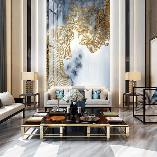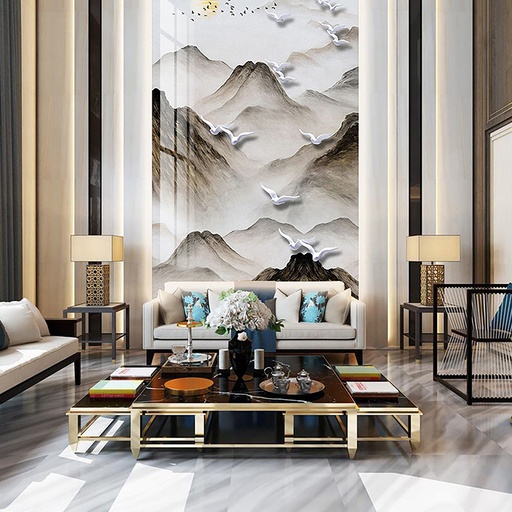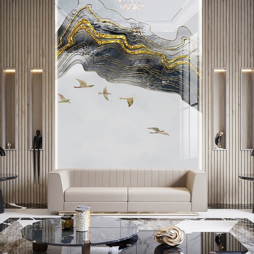Tranh PVC vân đá thông tầng là giải pháp lý tưởng cho các công trình kiến trúc cao cấp, đòi hỏi sự hoành tráng và liền mạch. Chúng thường được ứng dụng để tạo điểm nhấn cho các mảng tường lớn tại vách tivi, tường sau sofa, khu vực giếng trời, sảnh đón khách của biệt thự, hoặc tường thang máy trong các căn Penthouse. Vẻ đẹp của chúng không chỉ gói gọn trong những không gian rộng lớn, mà còn có thể linh hoạt ứng dụng tương tự như tranh PVC vân đá phòng khách thông thường, giúp đồng bộ hóa phong cách thiết kế trong toàn bộ căn nhà. Dù theo đuổi phong cách cổ điển, tân cổ điển hay hiện đại, bộ sưu tập của 3K Home luôn có những mẫu tranh phù hợp để nâng tầm đẳng cấp không gian sống của bạn.